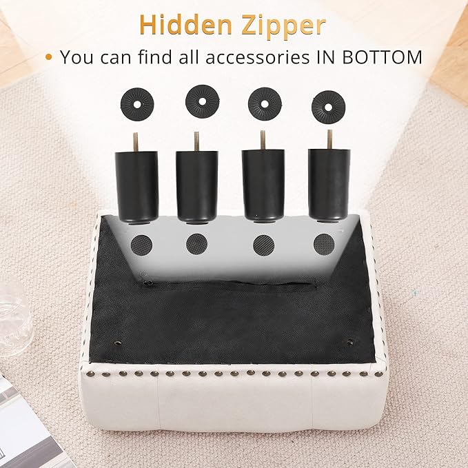 - 【HDDEN ZIPPER】The footstools ottoman has hidden zipper on bottom and you can find all accessories you need on bottomn. After Assemble it, it can be a small storage space for you and your kids to hide small stuffs, such as small toy, candy and receipt.