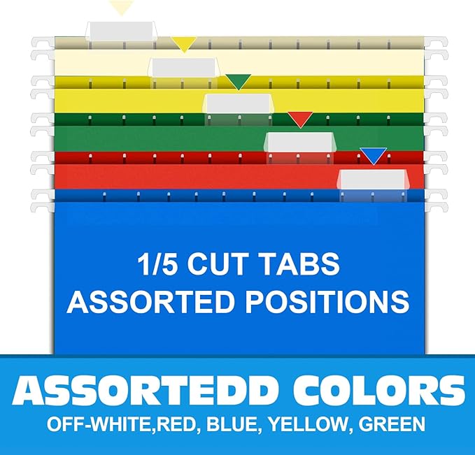 - HANGING FOLDERS SET: Contains 60 extra capacity folders with 60 cardboard supports, 60 printable label sheets, 60 clear plastic tabs and comes in 5 assorted primary colors (beige, red, blue, yellow, and green) to make color coded filing a snap.