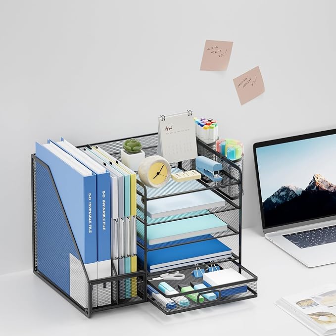 Lavatino Desk Organizer with File Holder, 5-Tier Paper Letter Tray Organizer with Sliding Drawer and 2 Pen Holder, Mesh Desktop File Organizer for Office Supplies (Black)
