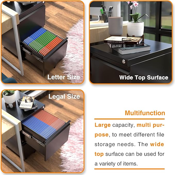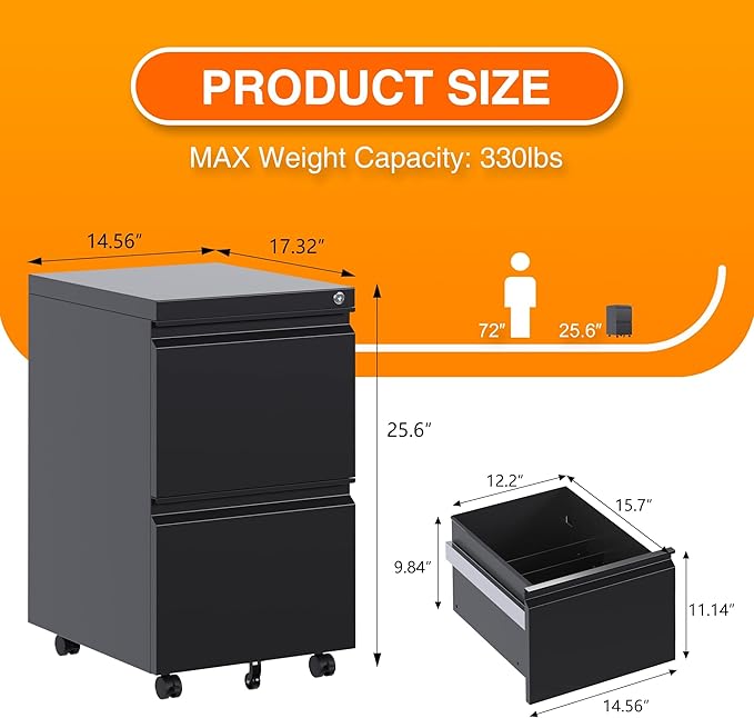 - 【ADD MORE MOBILITY】This 2 drawer file cabinet arrives with five casters, including two front casters with braking function and one center caster to prevent tipping