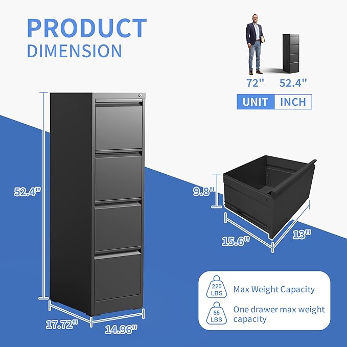 - 【Anti-tilt Design】This filing cabinet 4 drawer designed with full extension and steel ball-bearing suspension, all drawers of the file cabinets can be opened and closed quietly and easily. The anti-tilt system ensures that only one drawer can be open at a time, preventing the metal file cabinet from tipping over. You can have peace of mind knowing that your important documents and items are safe and secure.