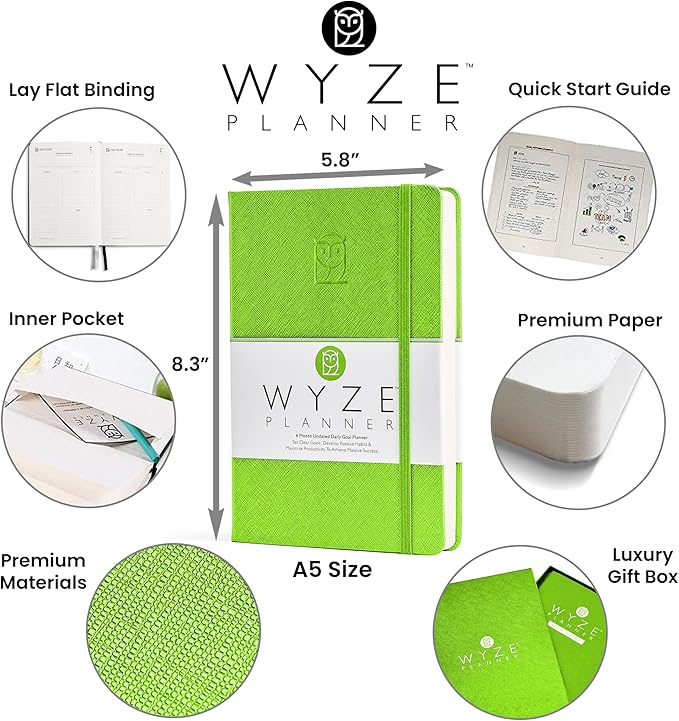 Undated Daily Planner – 6-Month A5 Productivity Organizer with Full Page Per Day, Hourly Schedule, Goal Setting, Habit Tracker, Weekly & Monthly Pages – Hardcover Time Management Notebook (Lime Green)