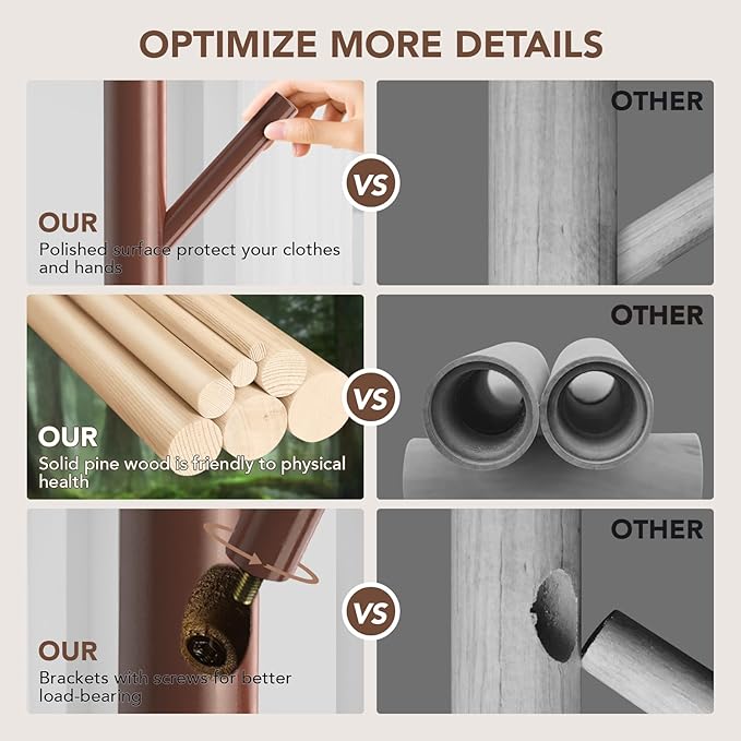 - Unique Craftsmanship: Hupmad freestanding coat rack is made of New Zealand pine wood, which is strong. The columns and hooks have a fine polished surface with a smooth and rounded feel. Protect your clothes from being scratched. The solid wood coat rack retains the natural wood grain and provides a simple and elegant versatile style