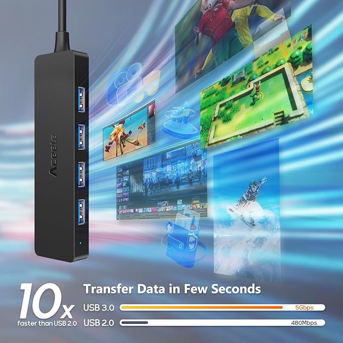 - 5Gbps High Speed Data Transfer: The Mac USB hub supports data transfer rates up to 5Gbps (10 times faster than usb 2.0) and can transfer a HD movie in seconds. β (Note: This hub is not designed to charge devices!).
