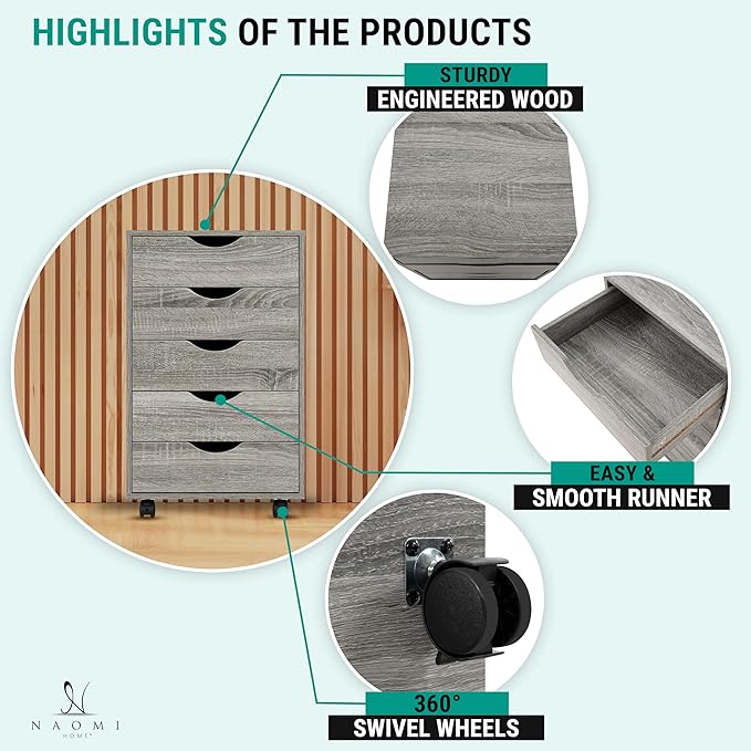 Naomi Home 5 Drawer Office Storage File Cabinet, Under Desk Cabinets for Organization Filing Cabinet with Wheels, Printer Stand Storage, 180 lbs Capacity - Gray Oak 11394AM