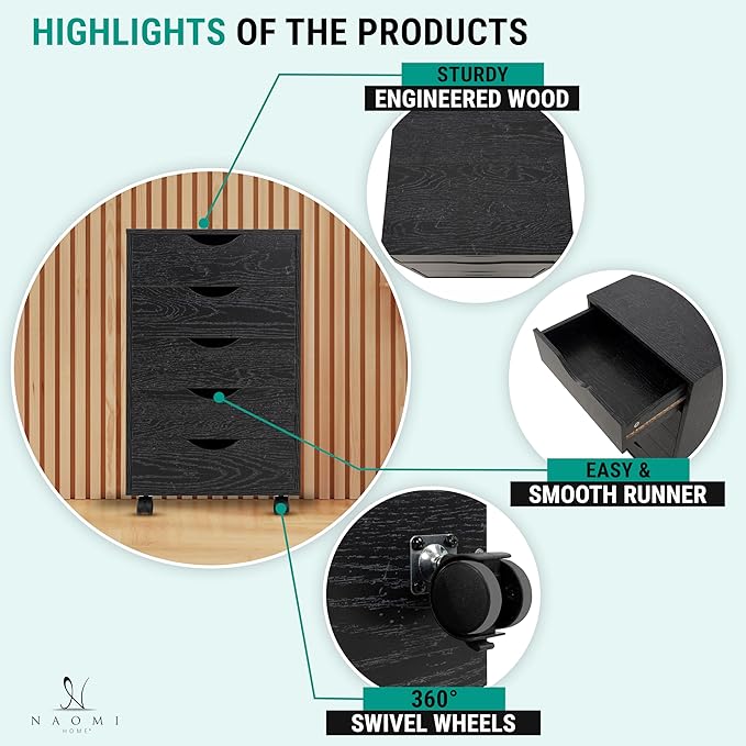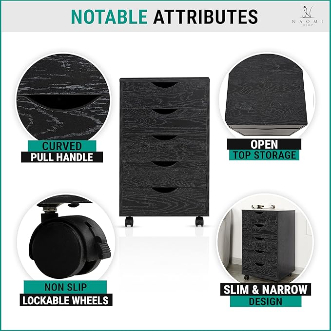 Naomi Home 5 Drawer Office Storage File Cabinet Under Desk Cabinets for Organization Filing with Wheels, Printer Stand Storage, 180 lbs Capacity, Distressed Black (11397AM)