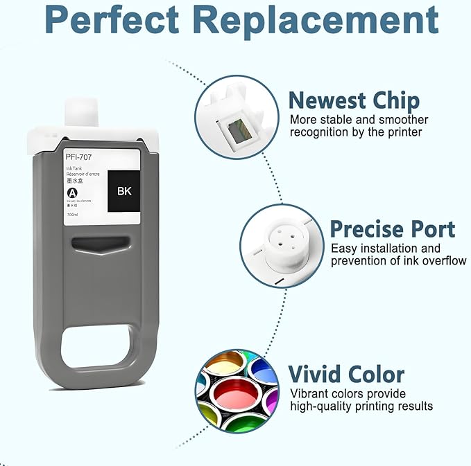 - Superior Quality: This high-yield PFI-707 ink cartridge uses the latest chip technology and high-quality pigment ink, with an anti clogging nozzle design and easy installation. Provide clear text and graphics, comparable to the original