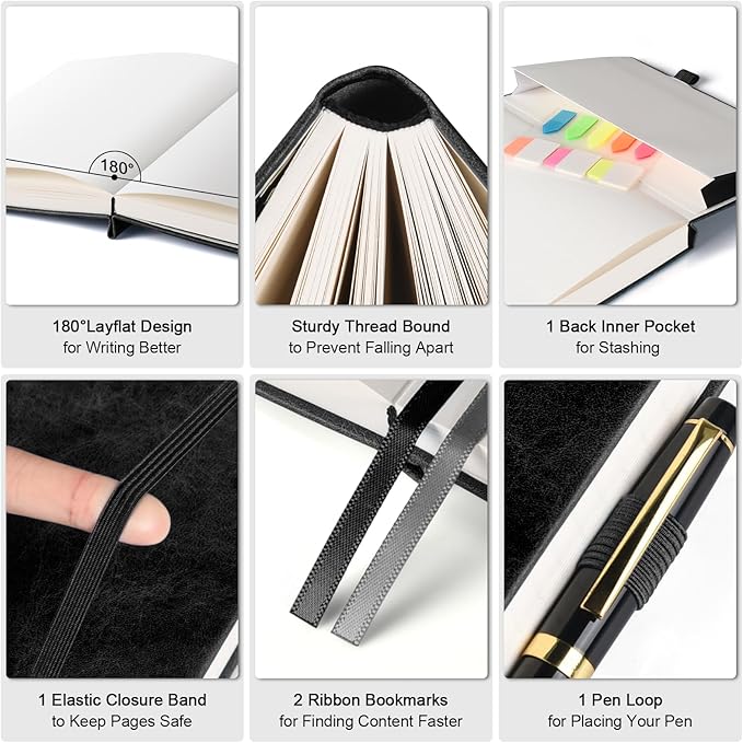 - 【Tough & Stylish Hardcover】Crafted from TOP-NOTCH VEGAN LEATHER with distinctive texture, which is animal-friendly and boasts a luxurious look. DURABLE hard cover provides superior protection to your pages compared to softcover, while offering a stable writing surface. Featuring an innovative thread-bound binding that allows for easy LAY-FLAT use, catering to both right-and left-handed users.