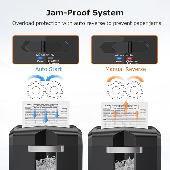 - [Jam Proof & Easy to Operate]bonsaii paper shredder has auto start/stop and manual reverse functions, which helps you clean up paper jams easily or when shred a useful file mistakenly, you can push to "REV" to reverse the paper.