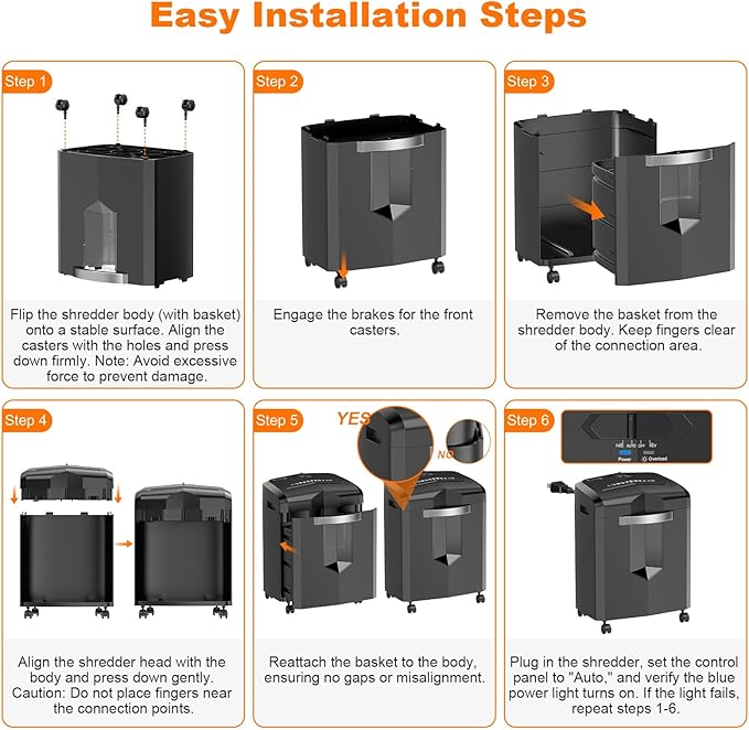 - Step 1: Flip the shredder body (with basket) onto a stable surface. Align the casters with the holes and press down firmly. Note: Avoid excessive force to prevent damage. Step 2: Engage the brakes for the front casters. Step 3: Remove the basket from the shredder body. Keep fingers clear of the connection area. Step 4: Align the shredder head with the body and press down gently. Caution: Do not place fingers near the connection points. Step 5: Reattach the basket to the body, ensuring no gaps or misalignment. Step 6: Plug in the shredder, set the control panel to "Auto," and verify the blue power light turns on. If the light fails, repeat steps 1–6.