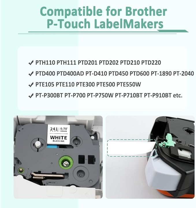 - Compatible for Brother P Touch Tze 18mm Label Maker: PT-D410, PT-D460, PT-D410VP, PT-D610BT, PT-D610BTVP, PT-D600, PT-D400, PT-D450, PT-E300, PT-H300, PT-E500, PT-E550W, PT-H500, PT-P700, PT-P710BT, PT-P715eBT, PT-P750W, PT-18R, PT-18RKT, PT-D800W, PT-E800W, PT-P900, PT-P900W, PT-P950NW, PT-P910BT