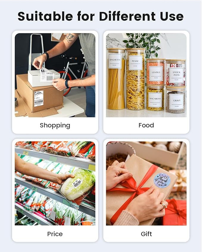 - [Multi-Platform Compatibility] - This shipping label printer supports label widths from 1 to 4.6 inches, making it ideal for printing labels from major platforms like eBay, Shopify, Amazon, Etsy, UPS, USPS, FedEx, and more. Easily print text, barcodes, QR codes, forms, and use pre-made templates for home or business. Note: The printer supports black-and-white printing only. For color labels, purchase compatible thermal color label paper separately.