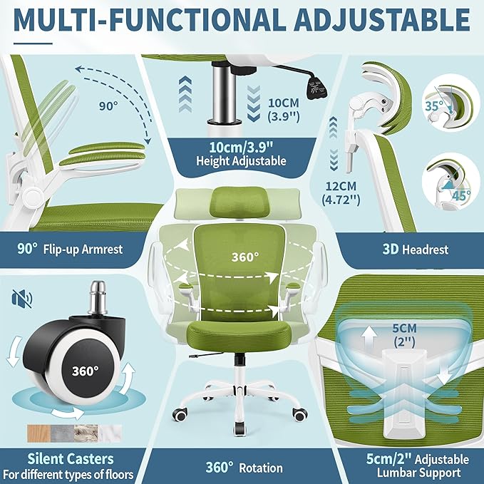 - Flexible Adjustable Functions:The rolling swivel computer chair is built with adjustable heigh: 10cm/3.9inch lift up and down, 5cm/2inch adjustable headrestοΌ30Β° flip upοΌ and backrest, 90-120Β° tilt adjustment, 90Β° flip-up handrail and 360Β° free rotation, supporting shoulder, back, waist and coccyx relaxation. Upgraded adjustable headrest and lumbar support, widened backrest and high-density armrests, which enhance ergonomically tailored comfort, to meet the needs of work and leisure time.