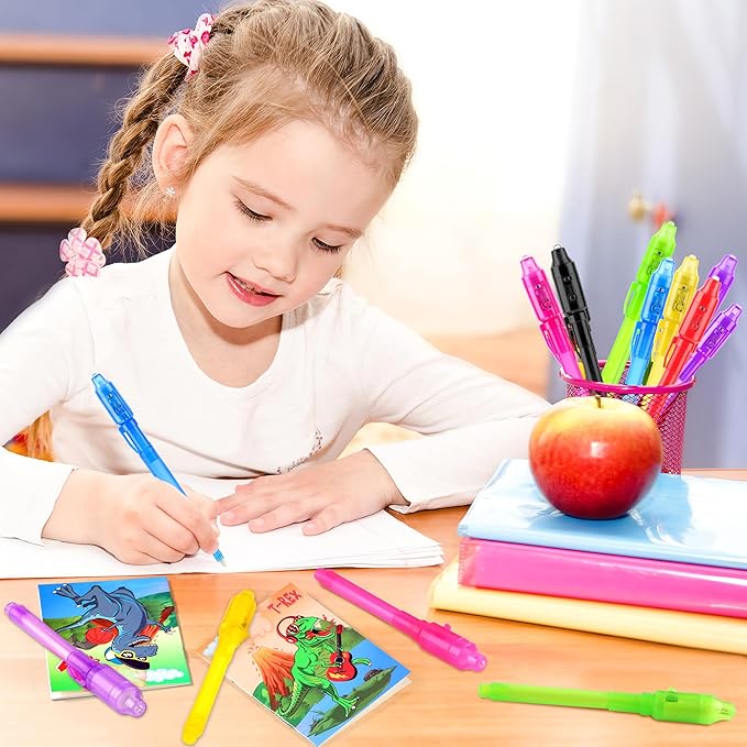 - Pack of 24 Invisible Ink Pen and Notebook - This top secret UV pen set includes 24 pens and 24 dinosaur-themed mini notebooks. The invisible ink pens have 8 colors to choose from: blue, black, red, pink, orange, yellow, green, or purple! All inks are invisible and UV LED lights are purple. The notebooks are designed with a dinosaur theme, which is cool and perfect for dinosaur party favors!