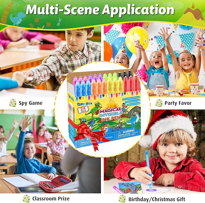 - Awesome Dinosaur Party Favors - These glow in the dark party supplies are ideal and unique dinosaur party favors for kids 8-12. Suitable for any occasion like birthday parties, classroom prizes, or goodie bag stuffers. Perfect dinosaur play kit for games like the escape room, spy games, riddles, skin tattoos, etc. Whether you’re looking for a game for your kids or organizing a dinosaur-themed spy party, this invisible ink pen set will provide hours of entertainment.