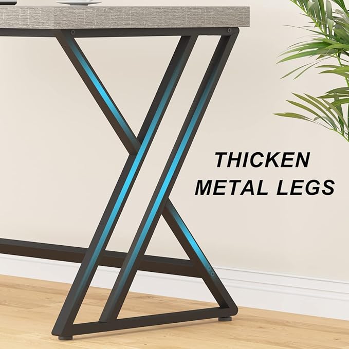 - Ample Desk Space & Adaptable Leg Area: The thick table surface offers plenty of work area for your computer, books, documents, printers, and desk supplies. The industrial-style home office desk has a sleek design that makes it suitable for spaces of any size and style. This long work desk has additional metal supports that free up your legs to work more fluidly. This big writing and studying table is the perfect option for tall individuals as it allows for plenty of legroom.