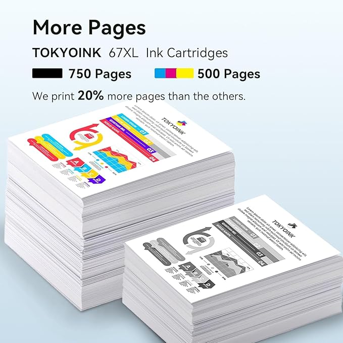 - Outstanding Performance: Replacement for hp 67xl ink cartridges black/color combo pack delivers high-quality printing results - sharp text, vibrant colors and true-to-life pictures, comparable to original cartridges. Choose TOKYOINK for printer ink hp 67 ink cartridges with significant cost savings without compromising on print quality!