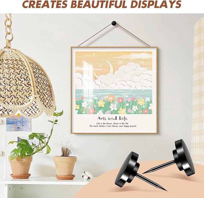 - 【Easy Installation】In the shape of ordinary push pins with black color, these metal push pins are easy to install without causing damage to your walls. Simply tap them in with minimal effort using a picture hanging tool, and you're ready to showcase your favorite wall art or decorations, these metal push pins and picture hanging hooks are perfect for heavy-duty use.