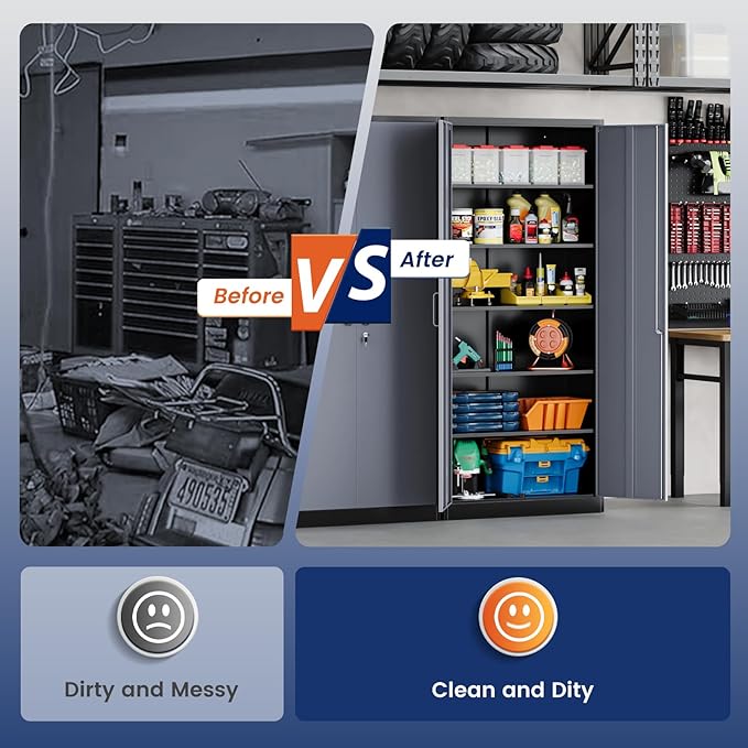 - 『PRACTICAL DESIGN』:Our tall metal cabinet equipped with lock and 5 adjustable shelves to provide adaptability and convenience. High-grade lock picking to secure valuables, two keys are included. Regardless of what your storage needs are, you have the ability to create a unique storage space to suit them.
