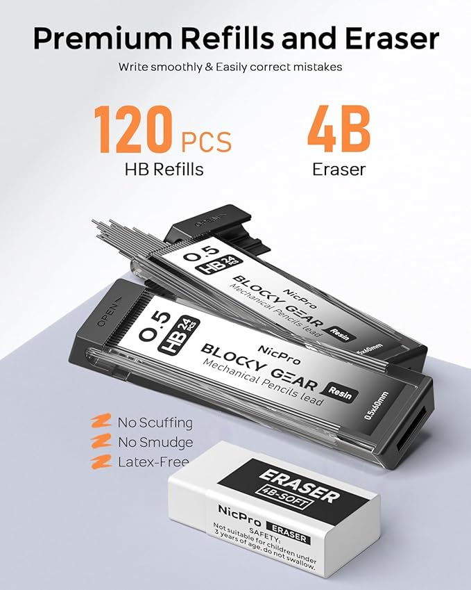 - Nicpro Blocky Gear:Come with a metal 0.5mm mechanical pencil and 2 tube of 0.5 mm HB lead refills,60pcs / tube,1pcs 4B latex-free eraser,9pcs replaceable cap erasers,all the stuff storage neatly in a case with flocking tray,what a gift for friends & family!