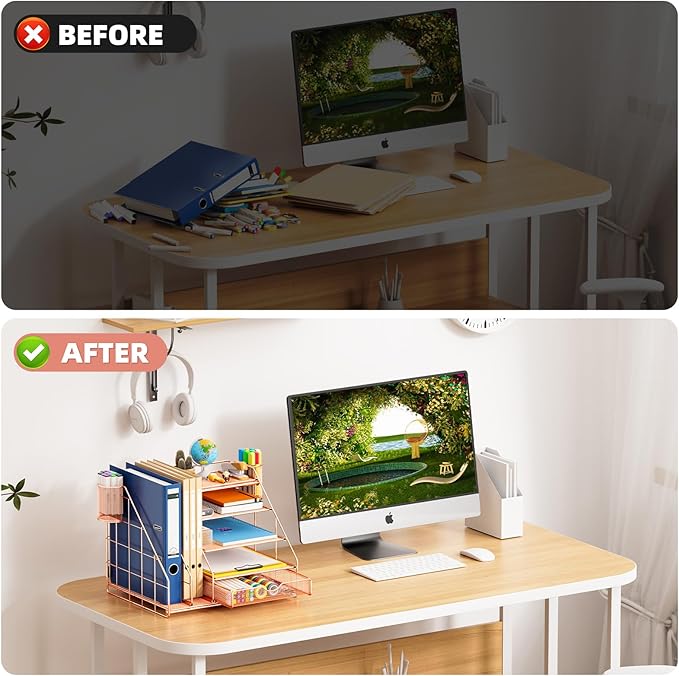 - 【Large Capacity】The desk organizer maximizes both the storage area and your desk's available space. For your notebooks, magazines, letters, and A4 paper, the ladder paper tray organizer would provide ample space. If you have documents and folders to store, consider using the vertical file holder to keep your office documents in order. The drawer organizer and hanging pen holder are enough to accommodate all office supply accessories and so on. Perfect Size:14.4*11*12inch