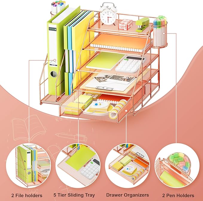 Marbrasse Desk Organizer with File Holder, 5-Tier Desk Organizers and Accessories with Drawer and 2 Pen Holder, Mesh Paper Letter Tray, Desktop Organizer and Storage for Office Supplies (Rose Gold)