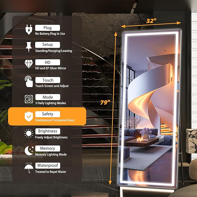 - 【Dimmable & 3 Color Temperature】This lighted full length mirror is multifunctional. You can press the button to change the color temperatures: Warm(3000K), natural (4000K) and white(6000K). You can also dim the brightness to your comfortable level. All these will be easily controlled by the touch button.
