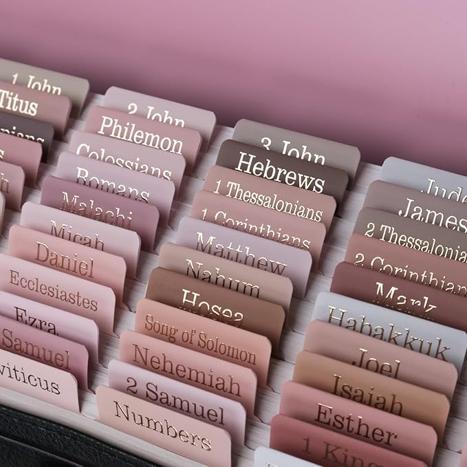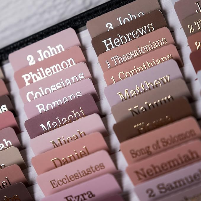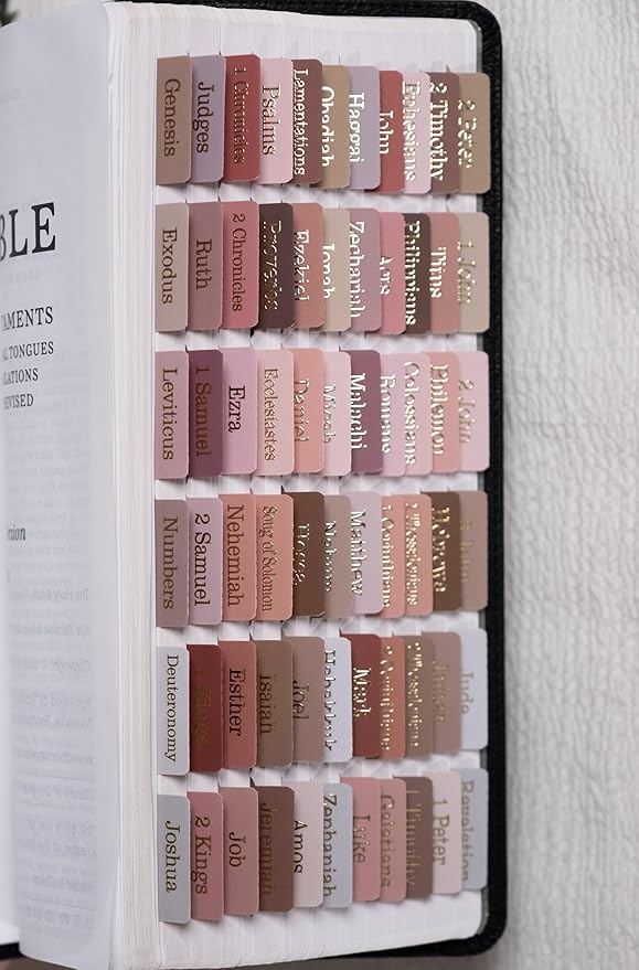 - Large Print, Easy to Read & Easy to Install: Silky velvet touch laminate,carefully designed pretty Bible accessories . The peel-and-stick Bible index tabs are self adhesive, simply align them with the provided guide or place them creatively.