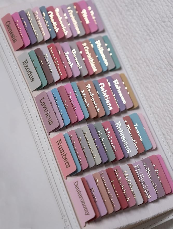 - Large Print, Easy to Read & Easy to Install: Silky velvet touch laminate,carefully designed pretty Bible accessories . The peel-and-stick Bible index tabs are self adhesive, simply align them with the provided guide or place them creatively.