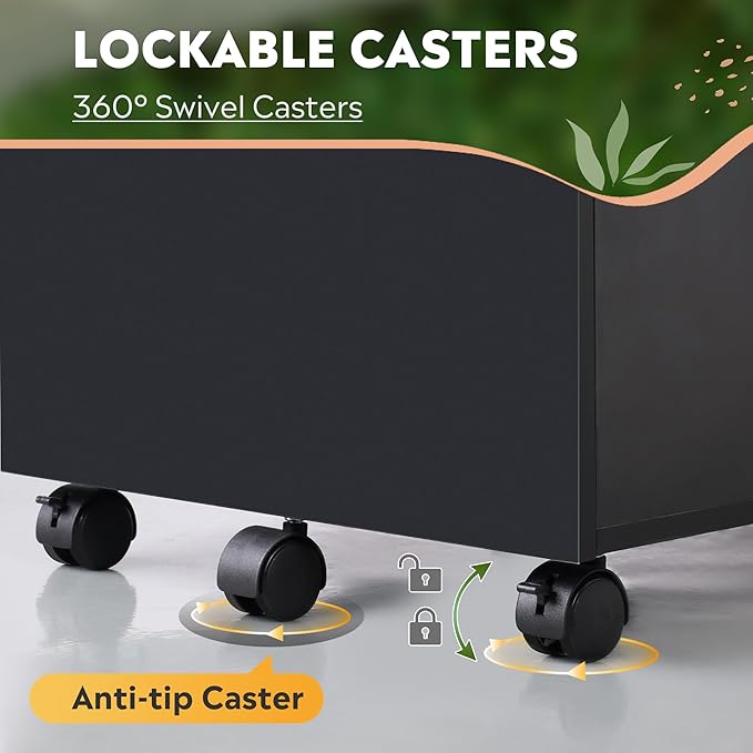 - Easy to Move: The rolling file cabinet has 5 wheels, it can fix or move around your home office freely. Built-in brakes on front 2 casters to keep the filing cabinet in position and add stability. The bottom drawer with a caster under it that can prevent tipping.