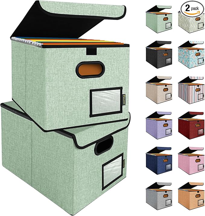 - [DURABLE MATERIAL] The outer layer of our filing box is crafted from high-quality polyester fabric and reinforced with thick cardboard in the middle. This construction ensures that the box maintains its shape and provides better bearing capacity for important documents and files. Its textured appearance can also serve as a stylish decorative element in any office or home.