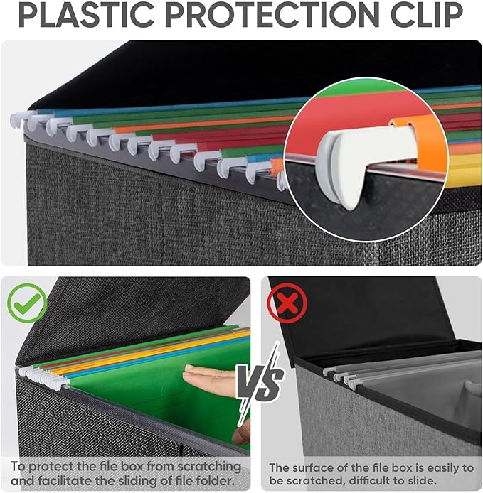 - [UNIVERSAL SIZE] Our file box with lid fits letter-sized files. It is designed for efficiency and functionality, with its smooth PVC slide rails on both sides, you can effortlessly slide file folders for easy access and neatly arranged. The lid fits snugly on the box after hanging folders. (NOTE: file folders are not included)