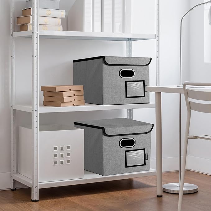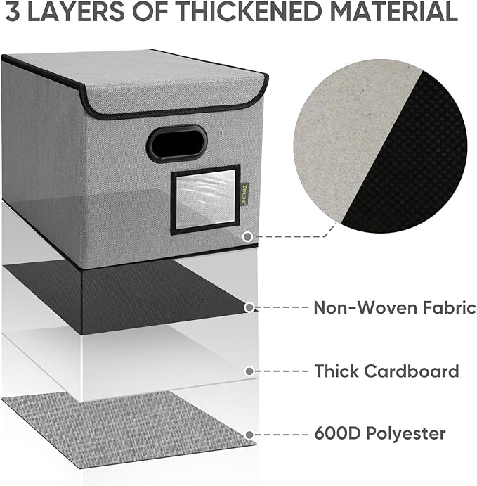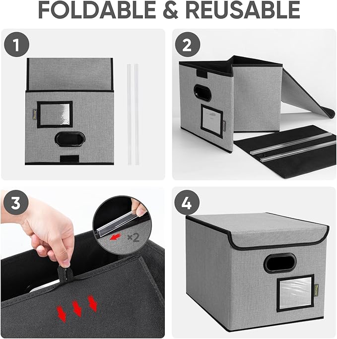 - [OPTIMIZED DESIGN] Designed with convenience in mind, our file storage box helps to elevate your efficiency and organization. The transparent label slot allows for quick identification of the contents stored inside the box. The collapsible design and sturdy handles ensure effortless storage and movement, making it convenient and easy to use.