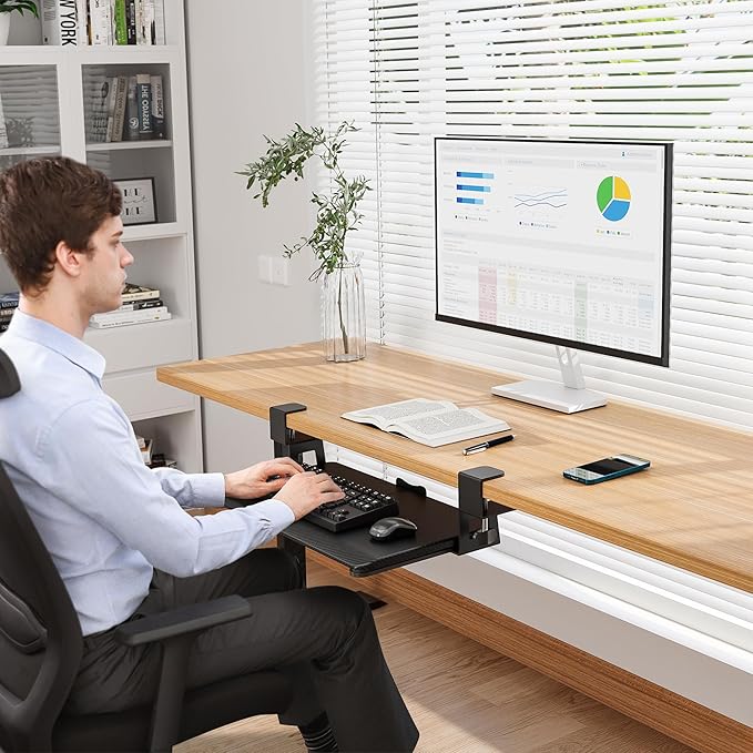 - ✅ MAXIMIZE YOUR DESK SPACE – Free up your desktop by placing your keyboard and mouse on this smooth slide-out tray. The ergonomic position helps reduce wrist strain while keeping your workspace tidy—perfect for offices, remote workstations, and gaming setups