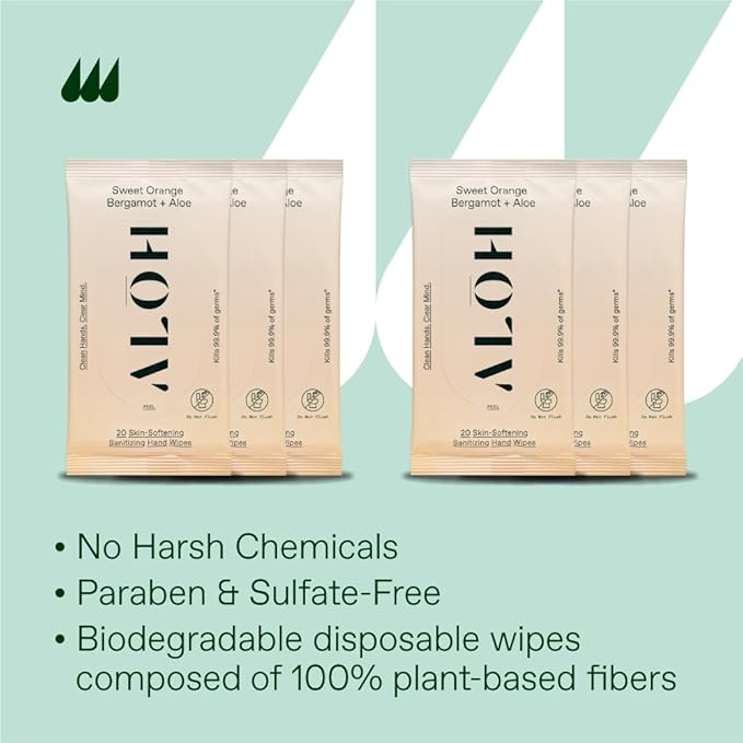 - LUXURY HIGH QUALITY FEEL: Many cloth sanitizing wipes feel rough, and quite frankly, cheap. Our hand wipes are luxuriously soft, like a high-quality baby wipe, acting as skin-hydrating treatment in one step, all while refreshing the senses with pure essential oils. Our travel-friendly ALŌH Sweet Orange Bergamont Skin Softening Hand Sanitizing Wipes help keep your hands clean with a single swipe without stripping skin, thanks to hydrating (never sticky!) aloe vera.