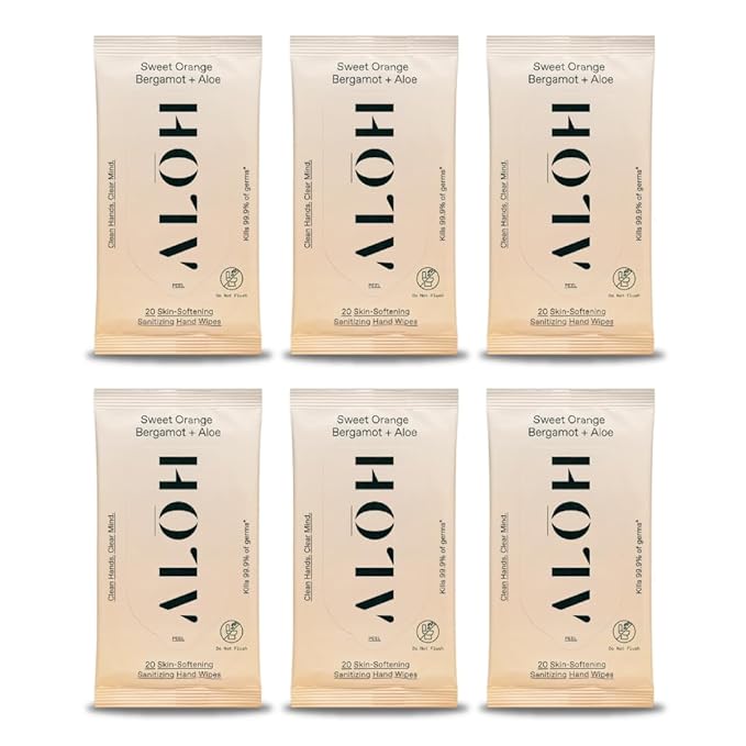 ALŌH Sweet Orange Bergamot + Aloe Sanitizing Hand Wipes - Clean Hands, Clear Mind - On The Go Hand Sanitizer Wipes for Kids and Adults - Travel Size 6 Packs 20ct Wipes (120 wipes)