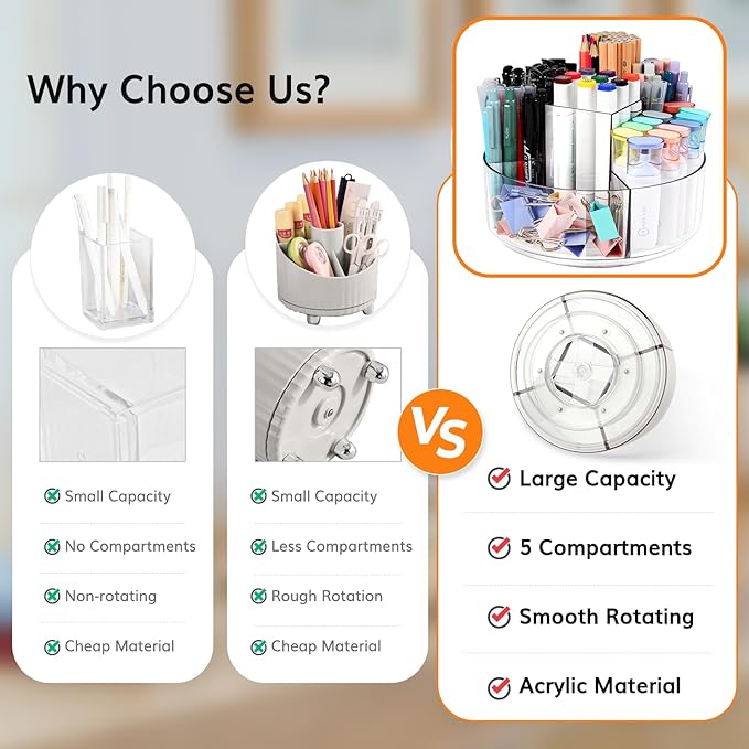 - 【Super Large Capacity to Keep Desktop Tidy】The diameter of our pencil holder is 6.9 inches, with a height of 6.1 inches. This capacity is larger than any other pencil holder. With the 5 compartments of this acrylic pen holder for desk, you can effortlessly organize and classify your items. The central compartment of the pencil holder is raised, allowing you to store longer and taller items.