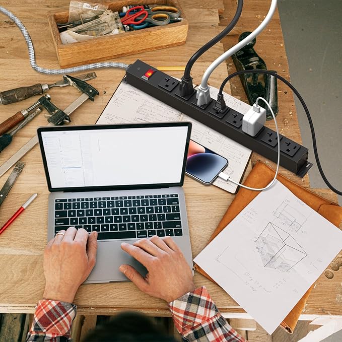 - ✔METAL WALL MOUNT POWER STRIP: This mountable power strip boasts a high-quality metal casing, ensuring durability and making it perfect for use in the garage, workshop, office, or on a workbench. With 4 metal mounting holes, it facilitates quick installation on desktops, under tables, workbenches, or walls, accommodating both vertical and horizontal setups.