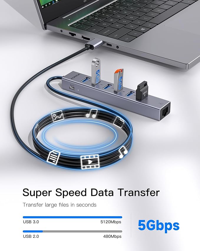 - 【5Gbps usb hub ethernet】The usb multiport adapter provides up to 5 Gbps data transfer speed, which is more than 10 times faster than USB 2.0, and it is backwards compatible with USB 2.0/1.0