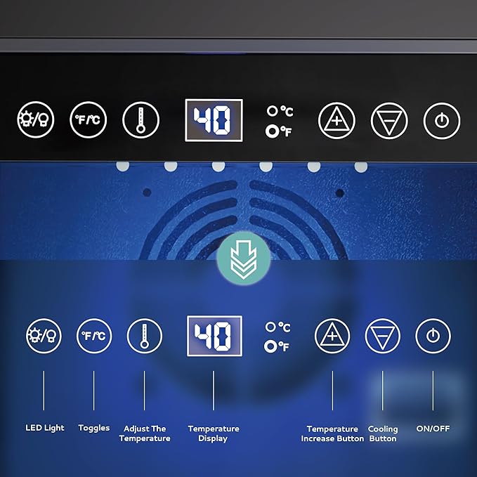 - One-touch operation & LED light - With an adjustable temperature range of 37-65Β°F (3-18Β°C), this beverage fridge offers easy one-touch settings at the touch of a button on the LCD display, providing speedy refrigeration at all times. The mini fridge built-in soft blue ambient LED lights keep your beverages in a classy atmosphere and can help you select your favorite drinks in a dark setting