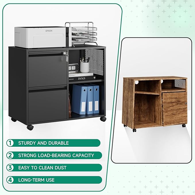 - 『Easy to move』4 removable wheels- printer stand can be moved and adjusted in position freely,2 wheels lockable to keep cabinet stable;Drawer with lock ensure the safety of items.