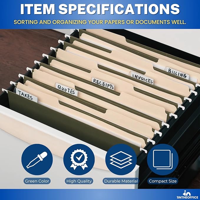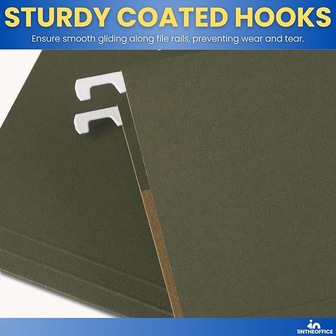 1InTheOffice Green Hanging File Folders Letter Size, Hanging Organizer File Folders, File Cabinet Folders, 1/5 Tabs, 11 pt, 50 Pack