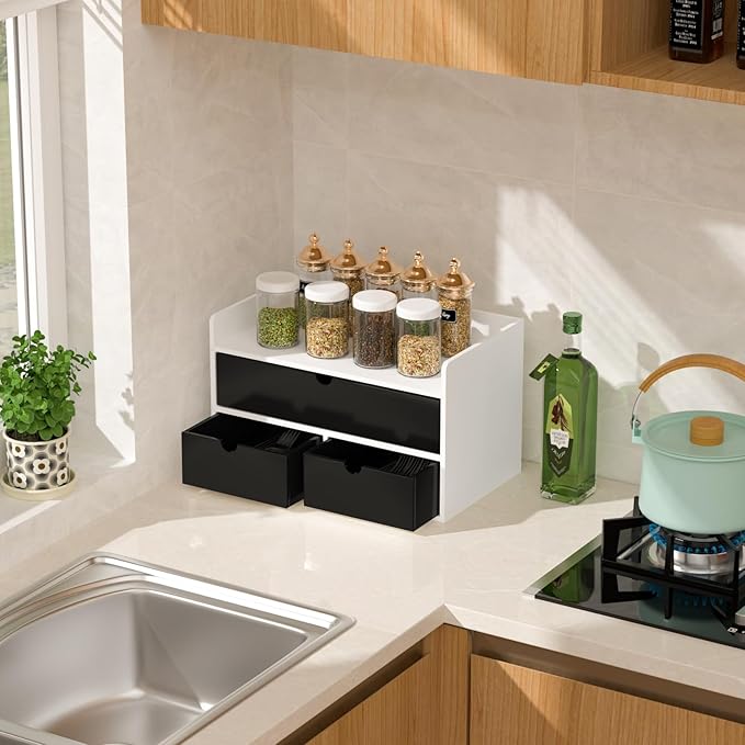 Wisuce Desk Organizer with Drawers - White-Black Bamboo Desktop Organizer Storage | Wood Desk Drawers Organizer for Bills, Office Supplies, Cosmetics, Seals No Assembled