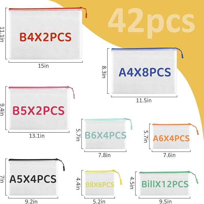 - PACKAGE CONTAINS:42pcs zipper bag for organizing storage: 2xB4 (15.6 x 11.2 inches), 2xA4 (13.6 x 9.6 inches), 2xB5 (11.6 x 8.4 inches), 2xA5 (9.4 x 6.8 inches), 2xB6 (7.8 x 5.6 inches), 2xA6 (7 x 4.8 inches), 4xBills (9.4 x 4.2 inches), 2xB8 (5.4 x 3.8 inches). Storage bags is store teaching supplies such as pencils, books, rules, include handwork collection