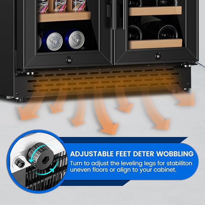 - 【Quiet and Efficient Cooling Performance】The dual zone beer and wine cooler is outfitted with an advanced compressor and a high-quality fan circulation system. The combination of these elements enables the even distribution of cold air throughout both cooling zones, ensuring a consistent level of humidity for each and every bottle and can stored within. With an operating noise level of less than 38 dB, it creates a peaceful and quiet environment, free from disruptive vibrations. The double-layered glass door not only acts as a barrier against UV rays, protecting the contents from potential damage, but also plays a crucial role in maintaining a stable internal temperature.