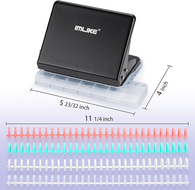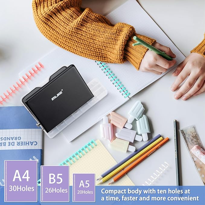 IMLIKE 10-Hole Binding Machine for Planners - Metal Manual Binding System with 10 Multi-Color 30-Hole Loose Leaf Binding Spines - Punches 26 Holes on B5, 30 Holes on A4, 20 Holes on A5 Paper - Black