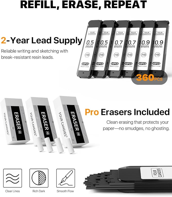 - Super Value Set This set contains 0.5, 0.7, 0.9mm drafting pencils and 360pcs HB Lead Refills, 3pcs 4B erasers, 9pcs eraser refills and a plastic storage case; This mechanical pencil set is ideal for writing, drawing, and sketching