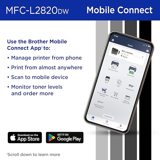 - BROTHER MOBILE CONNECT APP – Print, scan, and manage your wireless printer anytime, from almost anywhere from your mobile device. Order Brother Genuine Supplies, track toner usage, and complete more work on-the-go(6)