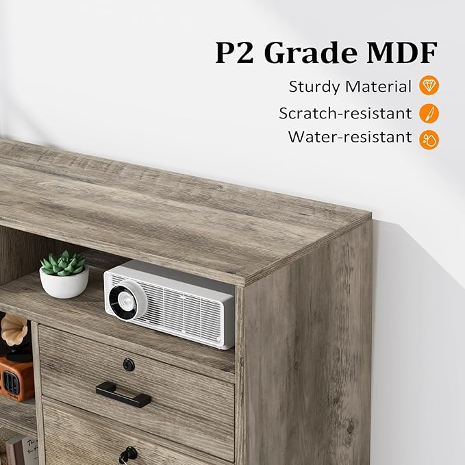 VINGLI Wide 4 Drawer File Cabinet with Lock, Rustic Grey Rolling File Cabinet with Open Shelves, Lockable Printer Stand, Letter Sized
