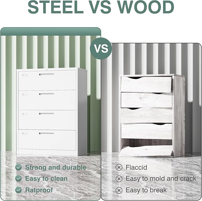- 〖Durable Metal Material〗File cabinet is made of 0.8mm thick steel,whole is solid and does not deform, and it is stronger than wooden filing cabinets in terms of firmness, durability, moisture resistance, and fire protection.